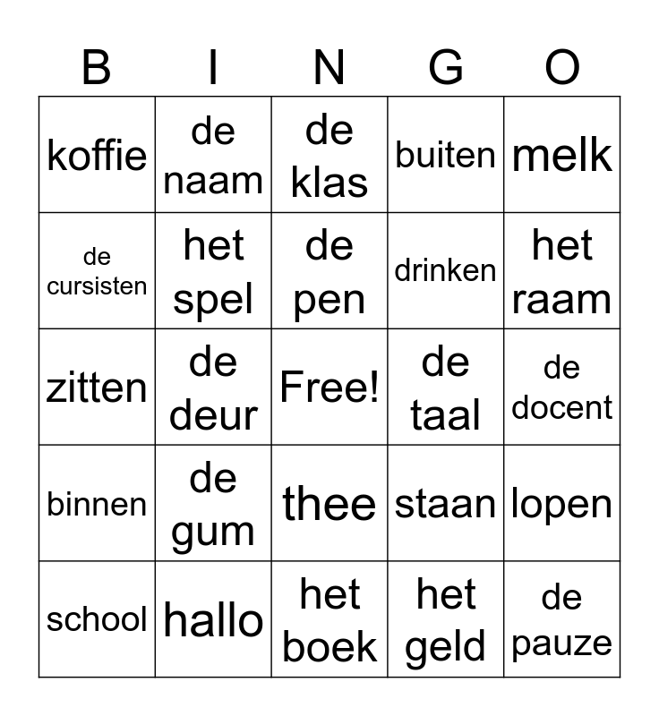 This bingo card has a free space and 24 words: de gum, hallo, de pen, school, melk, koffie, de cursisten, de naam, de taal, thee, drinken, zitten, staan, lopen, het spel, het geld, de docent, de klas, het raam, de deur, de pauze, binnen, buiten and het boek.