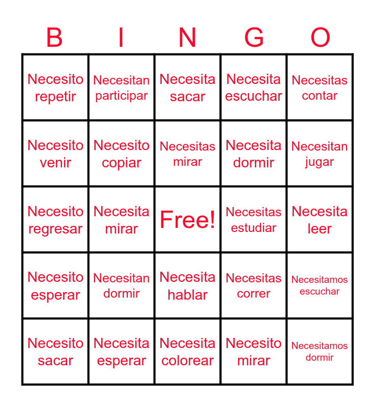This bingo card has a free space and 120 words: Necesito escribir, Necesita escribir, Necesitas escribir, Necesitamos escribir, Necesitan escribir, Necesito escuchar, Necesita escuchar, Necesitas escuchar, Necesitamos escuchar, Necesitan escuchar, Necesito caminar, Necesita caminar, Necesitas caminar, Necesitamos caminar, Necesitan caminar, Necesito hablar, Necesita hablar, Necesitas hablar, Necesitamos hablar, Necesitan hablar, Necesito sacar, Necesita sacar, Necesitas sacar, Necesitamos sacar, Necesitan sacar, Necesito esperar, Necesita esperar, Necesitas esperar, Necesitamos esperar, Necesitan esperar, Necesito mirar, Necesita mirar, Necesitas mirar, Necesitamos mirar, Necesitan mirar, Necesito comer, Necesita comer, Necesitas comer, Necesitamos comer, Necesitan comer, Necesito poner atencion, Necesita poner atencion, Necesitas poner atencion, Necesitamos poner atencion, Necesitan poner atencion, Necesito estudiar, Necesita estudiar, Necesitas estudiar, Necesitamos estudiar, Necesitan estudiar, Necesito correr, Necesita correr, Necesitas correr, Necesitamos correr, Necesitan correr, Necesito participar, Necesita participar, Necesitas participar, Necesitamos participar, Necesitan participar, Necesito firmar, Necesita firmar, Necesitas firmar, Necesitamos firmar, Necesitan firmar, Necesito venir, Necesita venir, Necesitas venir, Necesitamos venir, Necesitan venir, Necesito regresar, Necesita regresar, Necesitas regresar, Necesitamos regresar, Necesitan regresar, Necesito dormir, Necesita dormir, Necesitas dormir, Necesitamos dormir, Necesitan dormir, Necesito repetir, Necesita repetir, Necesitas repetir, Necesitamos repetir, Necesitan repetir, Necesito colorear, Necesita colorear, Necesitas colorear, Necesitamos colorear, Necesitan colorear, Necesito leer, Necesita leer, Necesitas leer, Necesitamos leer, Necesitan leer, Necesito contar, Necesita contar, Necesitas contar, Necesitamos contar, Necesitan contar, Necesito traer, Necesita traer, Necesitas traer, Necesitamos traer, Necesitan traer, Necesito copiar, Necesita copiar, Necesitas copiar, Necesitamos copiar, Necesitan copiar, Necesito jugar, Necesita jugar, Necesitas jugar, Necesitamos jugar, Necesitan jugar, Necesito empezar, Necesita empezar, Necesitas empezar, Necesitamos empezar and Necesitan empezar.