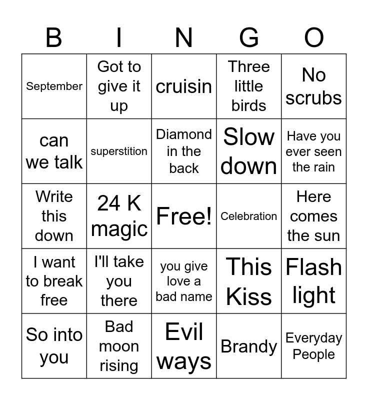 This bingo card has a free space and 29 words: So into you, Sweet caroline, 24 K magic, Feels Good, September, cruisin, superstition, I'll take you there, Celebration, Bad moon rising, Here comes the sun, Everyday People, Evil ways, Brandy, Have you ever seen the rain, You make my dreams come true, you give love a bad name, I want to break free, No scrubs, Write this down, This Kiss, All my ex's live in Texas, Slow down, can we talk, Three little birds, Got to give it up, Flash light, Diamond in the back and Shining star.