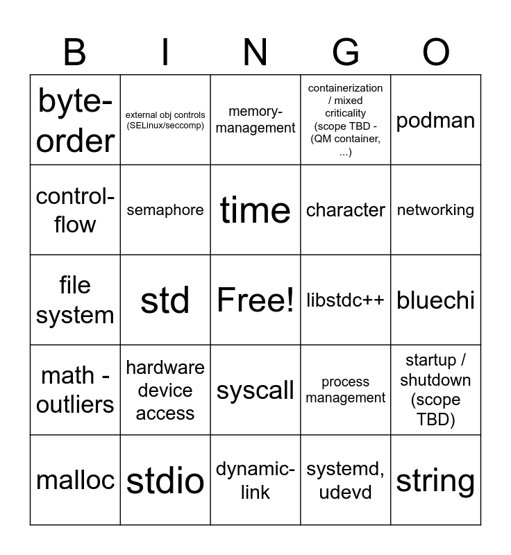 This bingo card has a free space and 44 words: math, string, memory management, malloc, descriptor, systemd, udevd, memory-management, scheduler/realtime, podman, stdio, containerization / mixed criticality (scope TBD - (QM container, ...), libstdc++, syscall, hardware device access, dbus-broker, dynamic-link, network, file system, file-system, networking, external obj controls (SELinux/seccomp), message-queue, nss, byte-order, clocks and timers (watchdogs), bluechi, errno, resource, process management, math - outliers, dirent, startup / shutdown (scope TBD), random, signal, std, sort-search, shared-memory, credentials, time, control-flow, character, thread, semaphore and environment.