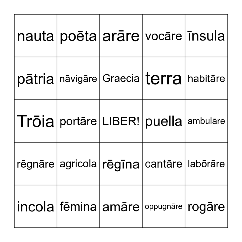 This bingo card has a free space and 24 words: agricola, fēmina, Graecia, incola, īnsula, nauta, pātria, poēta, puella, rēgīna, terra, Trōia, cantāre, labōrāre, nāvigāre, oppugnāre, ambulāre, arāre, habitāre, portāre, rogāre, rēgnāre, vocāre and amāre.