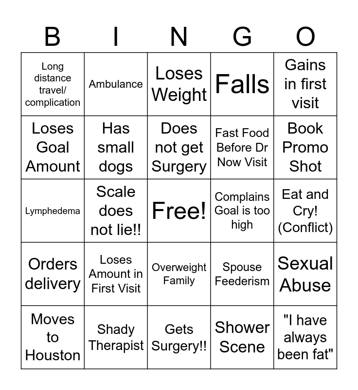 This bingo card has a free space and 24 words: Loses Amount in First Visit, Shady Therapist, Does not get Surgery, Moves to Houston, Gains in first visit, Long distance travel/ complication, Loses Goal Amount, Ambulance, Complains Goal is too high, Overweight Family, Fast Food Before Dr Now Visit, Lymphedema, Spouse Feederism, Sexual Abuse, Has small dogs, Shower Scene, Eat and Cry! (Conflict), Loses Weight, Book Promo Shot, Scale does not lie!!, "I have always been fat", Orders delivery, Falls and Gets Surgery!!.