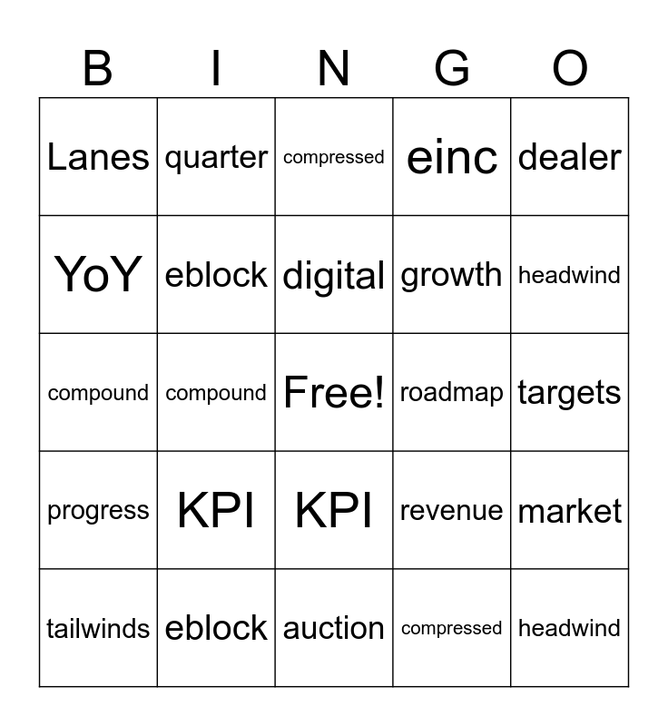This bingo card has a free space and 49 words: culture, headwind, tailwinds, auction, KPI, progress, quarter, industry, YoY, edealer, eblock, einc, market, revenue, targets, platform, digital, roadmap, evolve, dealer, compound, compressed, Lanes, growth, culture, headwind, tailwinds, auction, KPI, progress, quarter, industry, YoY, edealer, eblock, einc, market, revenue, targets, platform, digital, roadmap, evolve, dealer, compound, compressed, lanes, growth and product.