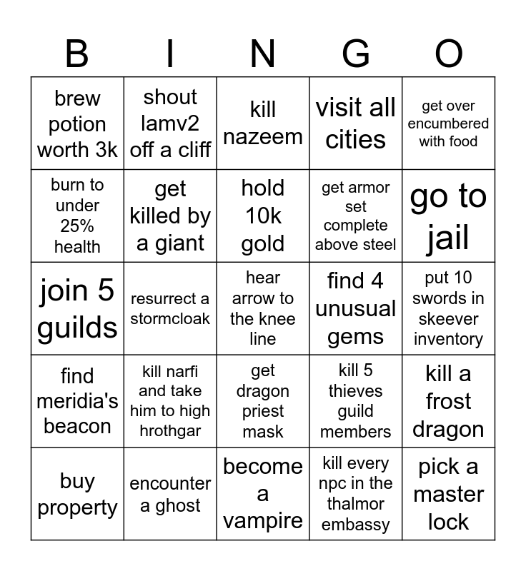 This bingo card has 25 words: kill narfi and take him to high hrothgar, become a vampire, hold 10k gold, buy property, get over encumbered with food, brew potion worth 3k, burn to under 25% health, shout lamv2 off a cliff, find 4 unusual gems, get dragon priest mask, get armor set complete above steel, join 5 guilds, kill 5 thieves guild members, kill a frost dragon, get killed by a giant, pick a master lock, put 10 swords in skeever inventory, kill nazeem, go to jail, resurrect a stormcloak, hear arrow to the knee line, encounter a ghost, find meridia's beacon, visit all cities and kill every npc in the thalmor embassy.
