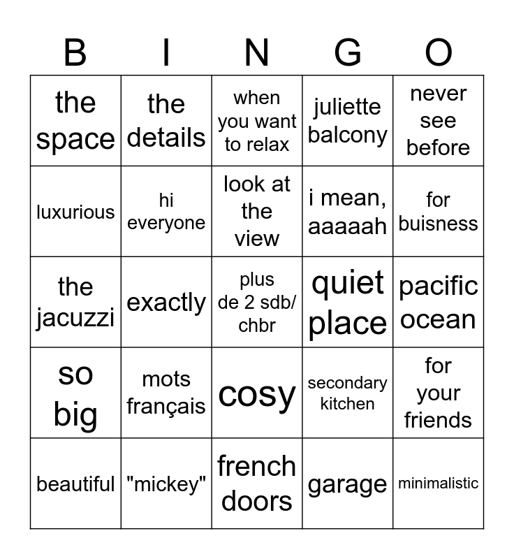 This bingo card has a free space and 24 words: mots français, "mickey", look at the view, beautiful, never see before, the space, luxurious, the details, quiet place, cosy, i mean, aaaaah, the jacuzzi, secondary kitchen, for your friends, hi everyone, garage, pacific ocean, when you want to relax, for buisness, exactly, minimalistic, so big, juliette balcony and french doors.