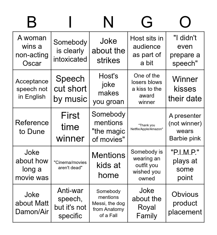 This bingo card has a free space and 40 words: Somebody says "Barbenheimer", Reference to Dune, Reference to Taylor Swift, Speech cut short by music, Anti-war speech, but it's not specific, Mentions kids at home, Host's joke makes you groan, Winner puts on reading glasses, "I didn't even prepare a speech", Joke about how long a movie was, First time winner, Host sits in audience as part of a bit, Obvious product placement, A presenter (not winner) wears Barbie pink, "Thank you Netflix/Apple/Amazon", "Cinema/movies aren't dead", Presenter or winner mentions Meryl Streep, A woman wins a non-acting Oscar, Standing ovation, Joke about the strikes, "P.I.M.P." plays at some point, Joke about the Royal Family, One of the losers blows a kiss to the award winner, Acceptance speech not in English, Somebody gives a really, really weird speech, The Rock mentions wrestling, Somebody cries on stage, Somebody mentions Barbie snub, Joke about Marvel, extended universes, superhero movies, etc, Saltburn reference or joke, More than three people on stage to accept a non-Best Picture award, Joke about Matt Damon/Air, Somebody gets bleeped during their speech for swearing, Somebody is wearing an outfit you wished you owned, Winner kisses their date, Somebody mentions Messi, the dog from Anatomy of a Fall, Poor things wins an Oscar, The show goes past its runtime (9 pm Central), Somebody is clearly intoxicated and Speech is less than 15 seconds.