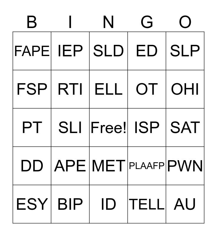 This bingo card has a free space and 24 words: APE, BIP, ELL, ESY, SLP, FAPE, FSP, IEP, ISP, MET, OT, PT, PLAAFP, PWN, RTI, TELL, SAT, SLD, OHI, SLI, AU, DD, ED and ID.