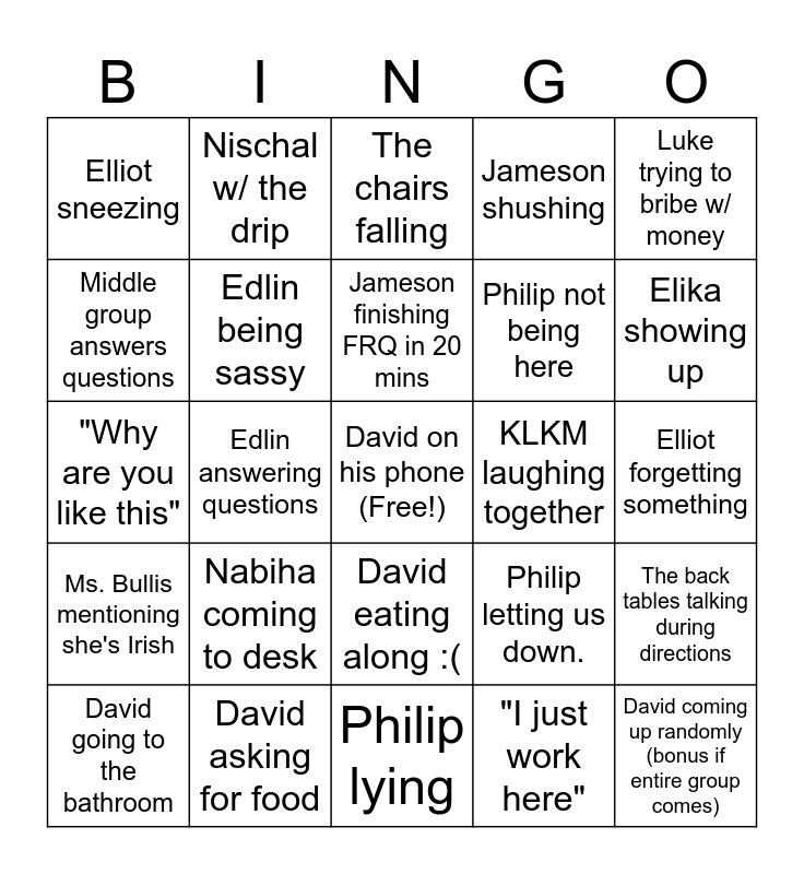 This bingo card has a free space and 24 words: Nabiha coming to desk, David asking for food, Jameson finishing FRQ in 20 mins, David going to the bathroom, Luke trying to bribe w/ money, Elliot sneezing, Middle group answers questions, Nischal w/ the drip, KLKM laughing together, David eating along :(, Philip not being here, "Why are you like this", Philip letting us down., The back tables talking during directions, Edlin being sassy, "I just work here", Elliot forgetting something, The chairs falling, Elika showing up, Edlin answering questions, David coming up randomly (bonus if entire group comes), Ms. Bullis mentioning she's Irish, Jameson shushing and Philip lying.
