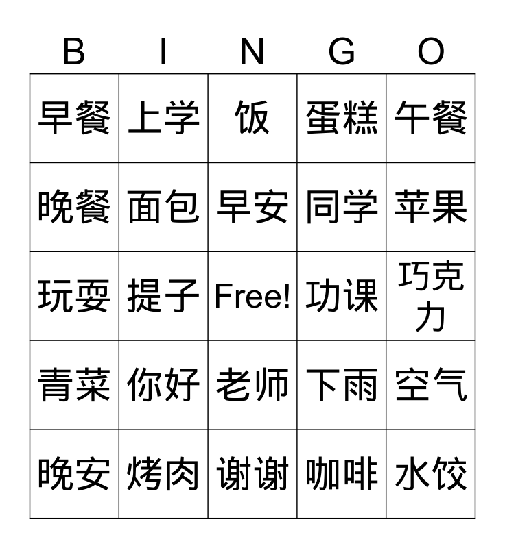 This bingo card has a free space and 25 words: 你好, 谢谢, 早安, 晚安, 午餐, 早餐, 晚餐, 上学, 功课, 老师, 同学, 玩耍, 下雨, 空气, 面包, 香蕉, 巧克力, 饭, 苹果, 提子, 水饺, 烤肉, 青菜, 蛋糕 and 咖啡.