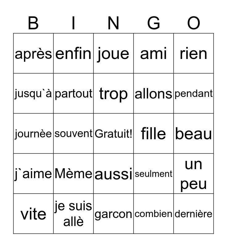 This bingo card has a free space and 24 words: Mème, je suis allè, trop, vite, rien, après, jusqu`à, enfin, fille, aussi, allons, journèe, seulment, un peu, partout, combien, beau, joue, pendant, souvent, dernière, j`aime, ami and garcon.