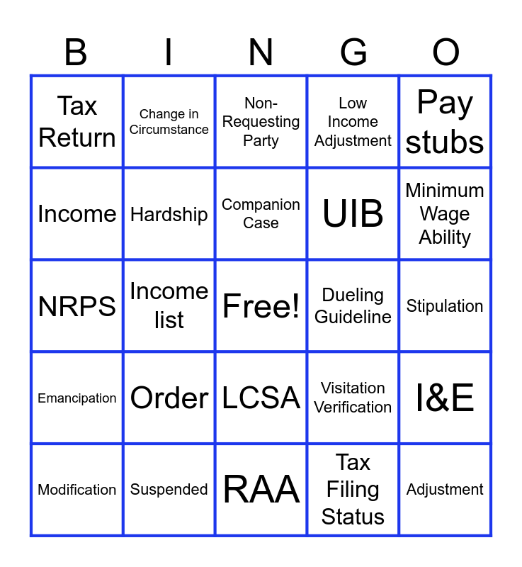 This bingo card has a free space and 50 words: Review, Adjustment, Court, RAA, Order, Current Support, Change in Circumstance, Guideline Calculation, Income, Dependents, Hardship, Low Income Adjustment, I&E, Visitation Verification, Timeshare, Childcare Verification, Companion Case, Dueling Guideline, W-2, Pay stubs, Income list, Tax Filing Status, Tax Return, UIB, DIB, Annualize, Minimum Wage Ability, Requesting Party, Non-Requesting Party, LCSA, LCSA-Initiated, Reviewing, Requesting, Terminated, Suspended, Court Order, Timeframes, Compliance, Mandatory Review, Stipulation, ROFO, CEJ, Verified, Notice of Motion, Modification, NRPS, Minimum Change Criteria, Reserved Order, Emancipation and Deductions.