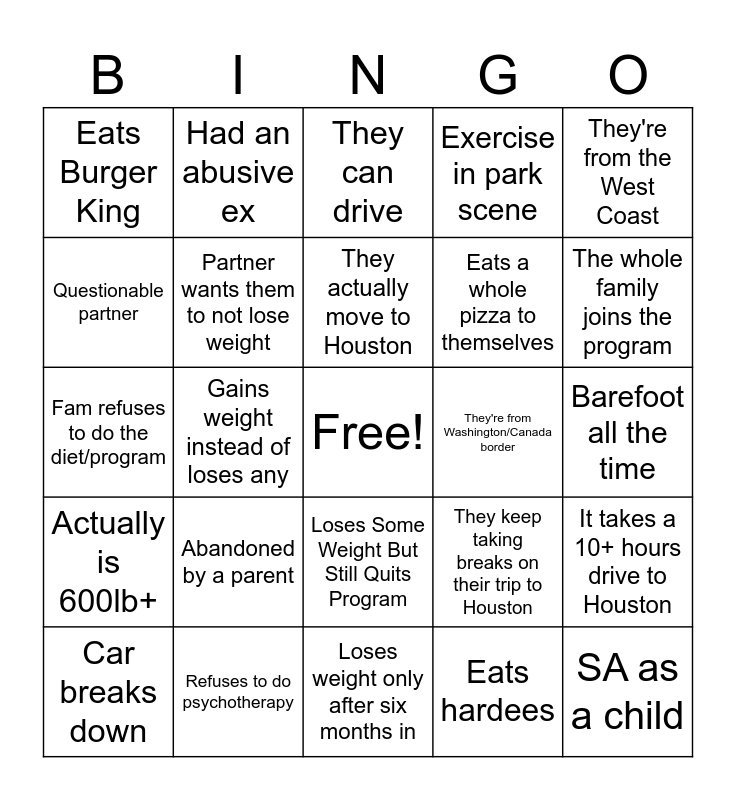 This bingo card has a free space and 52 words: Sent to a fat camp/put on a diet as a child, SA as a child, SA as an adult, Loses weight only after six months in, Abandoned by a parent, Single parent, Had an abusive ex, Abused by parent, Questionable partner, Partner cheats/leaves, Partner wants them to not lose weight, Loses weight in the beginning but still quits program, It takes a 10+ hours drive to Houston, They keep taking breaks on their trip to Houston, Actually gets the surgery but decides to quit the program, Actually get the surgery, They actually move to Houston, They're from Washington/Canada border, They're from Texas, They're from the West Coast, Gains weight instead of loses any, Eats hardees, Eats Burger King, Eats a whole pizza to themselves, Plate full of Bacon, Eats Jack in a Box, Eats Chick fil A, They have kids, The whole family joins the program, Plate full of eggs, Walker/wheelchair dependent, Exercise in park scene, Eats dessert after dinner, Exercise in gym/pool scene, Grocery shopping scene, They can drive, Refuses to do psychotherapy, Self aware but still self sabotages, Sits in the trunk/middle row of the car for Houston trip, Actually drives for the Houston trip, Needs help with shower/care, Barefoot all the time, Actually is 600lb+, Dr Paradise Makes an Appearance, Loses Some Weight But Still Quits Program, Does Psychotherapy, Dr Now calls out Fam for being Enablers, Fam refuses to do the diet/program, Delays Move to Houston for X-amount of reasons, Cheats on the diet for a "good excuse", Car breaks down and Isn't SAed.