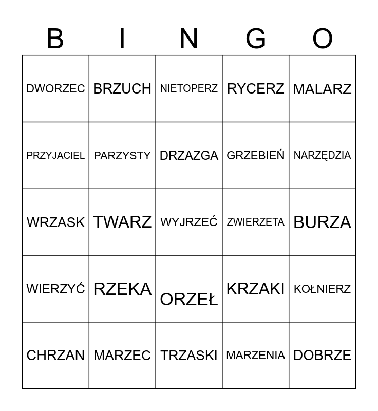 This bingo card has a free space and 24 words: RZEKA, MARZEC, DRZAZGA, CHRZAN, MALARZ, DWORZEC, PRZYJACIEL, BRZUCH, ZWIERZETA, ORZEŁ, GRZEBIEŃ, WRZASK, KRZAKI, KOŁNIERZ, PARZYSTY, MARZENIA, BURZA, NIETOPERZ, NARZĘDZIA, TWARZ, DOBRZE, WIERZYĆ, RYCERZ and TRZASKI.