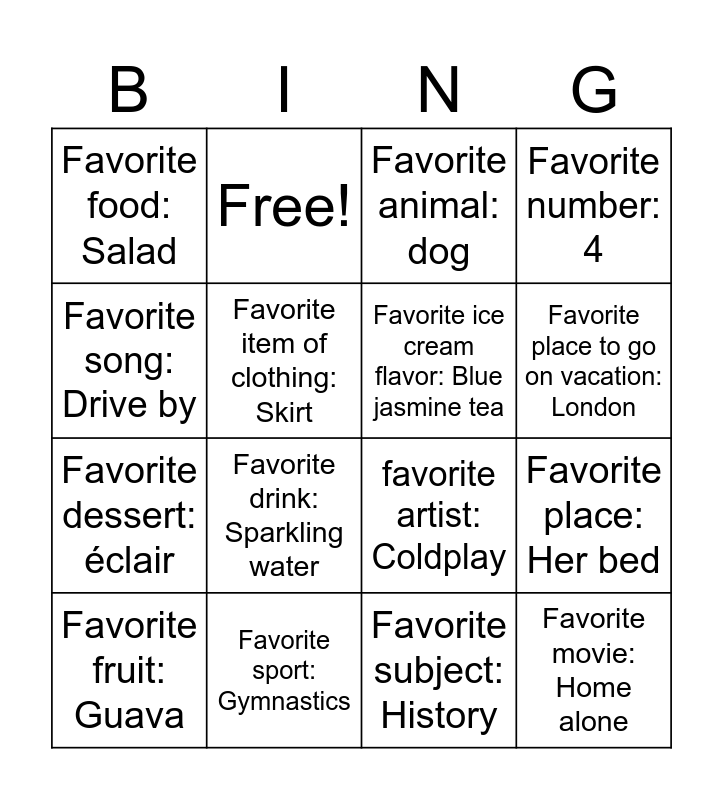 This bingo card has 19 words: favorite artist: Coldplay, Favorite color: Indigo, Favorite animal: dog, Favorite movie: Home alone, Favorite place: Her bed, Favorite song: Drive by, Favorite subject: History, Favorite food: Salad, Free!, Favorite dessert: éclair, Favorite drink: Sparkling water, Favorite item of clothing: Skirt, Favorite ice cream flavor: Blue jasmine tea, Favorite sport: Gymnastics, Favorite fruit: Guava, Favorite restaurant : Denfina, Favorite number: 4, Favorite place to go on vacation: London and Favorite game: The game of life.