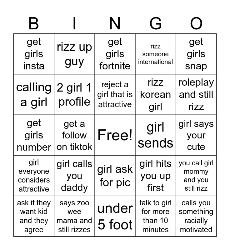 This bingo card has a free space and 24 words: girl calls you daddy, says zoo wee mama and still rizzes, reject a girl that is attractive, ask if they want kid and they agree, get girls snap, get girls insta, calling a girl, rizz up guy, girl sends, girl ask for pic, rizz korean girl, get girls number, girl hits you up first, you call girl mommy and you still rizz, 2 girl 1 profile, talk to girl for more than 10 minutes, girl says your cute, get girls fortnite, roleplay and still rizz, get a follow on tiktok, calls you something racially motivated, girl everyone considers attractive, rizz someone international and under 5 foot.