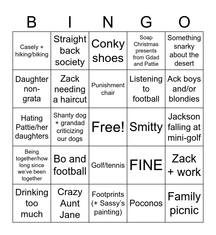 This bingo card has a free space and 24 words: Bo and football, Crazy Aunt Jane, Punishment chair, Drinking too much, Something snarky about the desert, Casely + hiking/biking, Daughter non-grata, Straight back society, Smitty, Golf/tennis, Listening to football, Hating Pattie/her daughters, FINE, Zack + work, Zack needing a haircut, Poconos, Jackson falling at mini-golf, Conky shoes, Ack boys and/or blondies, Shanty dog + grandad criticizing our dogs, Family picnic, Being together/how long since we’ve been together, Soap Christmas presents from Gdad and Pattie and Footprints (+ Sassy’s painting).