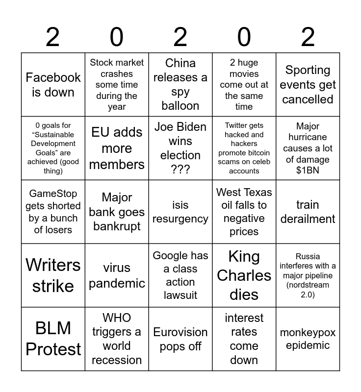 This bingo card has a free space and 24 words: virus pandemic, WHO triggers a world recession, Joe Biden wins election ???, BLM Protest, Sporting events get cancelled, Facebook is down, 0 goals for “Sustainable Development Goals” are achieved (good thing), Stock market crashes some time during the year, West Texas oil falls to negative prices, Google has a class action lawsuit, Twitter gets hacked and hackers promote bitcoin scams on celeb accounts, GameStop gets shorted by a bunch of losers, King Charles dies, Russia interferes with a major pipeline (nordstream 2.0), EU adds more members, interest rates come down, train derailment, China releases a spy balloon, Major hurricane causes a lot of damage $1BN, Major bank goes bankrupt, monkeypox epidemic, Writers strike, 2 huge movies come out at the same time and Eurovision pops off.