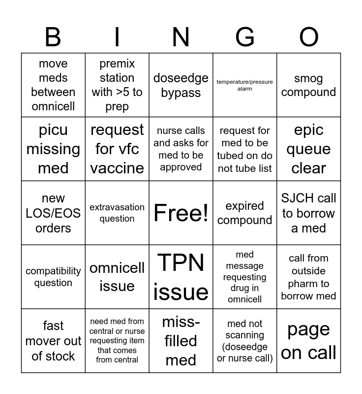 This bingo card has a free space and 54 words: missing lipid/adjust lipid time, compatibility question, can I crush/does this go in a gtube, call out/or >10 min late, TPN issue, stat alteplase, temperature/pressure alarm, code response needed, picu missing med, nurse has <1 hour on a drip, move meds between omnicell, med request for order put in <10 min ago, need med from central or nurse requesting item that comes from central, fast mover out of stock, tube station down, miss-filled med, page on call, request for med to be tubed on do not tube list, retail (break-in, counseling, nurse calling wrong #), SJCH call to borrow a med, med message requesting drug in omnicell, need new tackle box, expired compound, smog compound, new chemo/chemo issue, premix station with >5 to prep, page or call NNP, rec from a consult service, med sent secure returns in tube, med not scanning (doseedge or nurse call), trauma B/stab code/OB c-section, expired med (not compound), call from OR, pharm-is ticket, doseedge bypass, brand new TPN, new LOS/EOS orders, call from outside pharm to borrow med, tube shut down for full tube, request for vfc vaccine, recon antibiotic, ID home med, status board clear, request for on call electrolytes, omnicell issue, med message requesting med scanned into med bin, phone call from MD needing dose recommendation, critical dose warning override, nurse calls and asks for med to be approved, extravasation question, epic queue clear, IV room calls out for stock, DE rework and need to waste for a narc.
