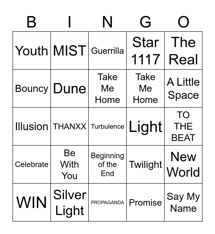This bingo card has 75 words: Crazy Form, One Day At A Time, Guerrilla, Answer, Fireworks, HALAZIA, Wave, WONDERLAND, Deja Vu, INCEPTION, Say My Name, HALA HALA, Take Me Home, Bouncy, Pirate King, THANXX, IT’s You, Turbulence, MATZ, The Real, Utopia, Illusion, Dune, MIST, Star 1117, The Leaders, This World, Treasure, Still Here, FEVER, Aurora, DJANGO, From, Twilight, A Little Space, Take Me Home, ARRIBA, Cyberpunk, TO THE BEAT, Promise, Don’t Stop, Sunrise, THE BLACK CAT NERO, Horizon, Everything, Eternal Sunshine, WIN, Youth, My Way, Good Lil Boy, All About You, Beginning of the End, Dancing Like Butterfly Wings, Desire, Wake Up, Outlaw, Crescent, Paradigm, ROCKY, Not Too Late, Be With You, Dreamers, Dazzling Light, The Ring, Stay, Light, Precious, WE KNOW, Sector 1, New World, Celebrate, Silver Light, Time Of Love, PROPAGANDA and Emergency.