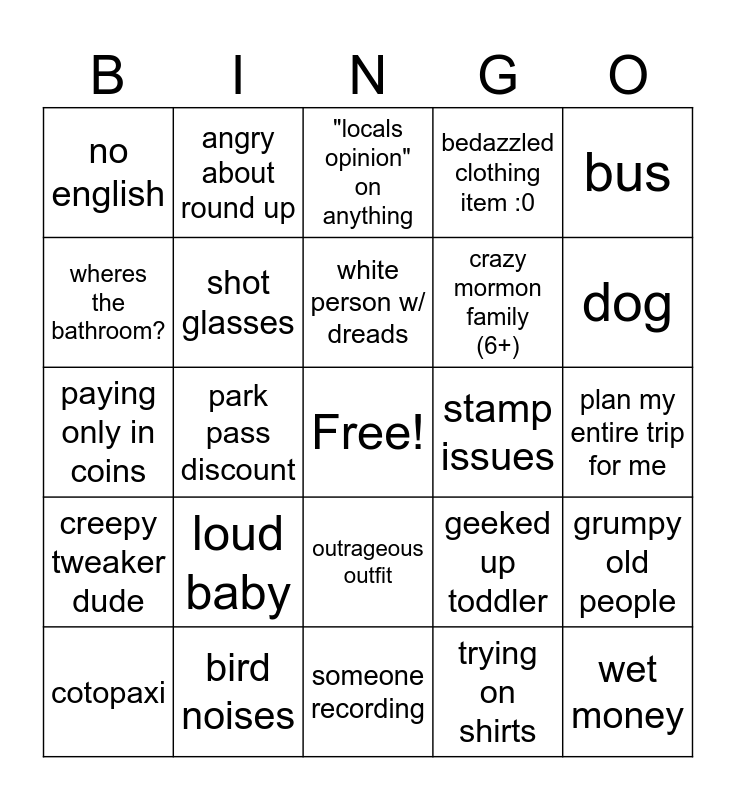 This bingo card has a free space and 24 words: loud baby, bird noises, white person w/ dreads, cotopaxi, bus, no english, wheres the bathroom?, angry about round up, stamp issues, outrageous outfit, crazy mormon family (6+), paying only in coins, geeked up toddler, grumpy old people, shot glasses, trying on shirts, plan my entire trip for me, "locals opinion" on anything, dog, park pass discount, wet money, creepy tweaker dude, bedazzled clothing item :0 and someone recording.