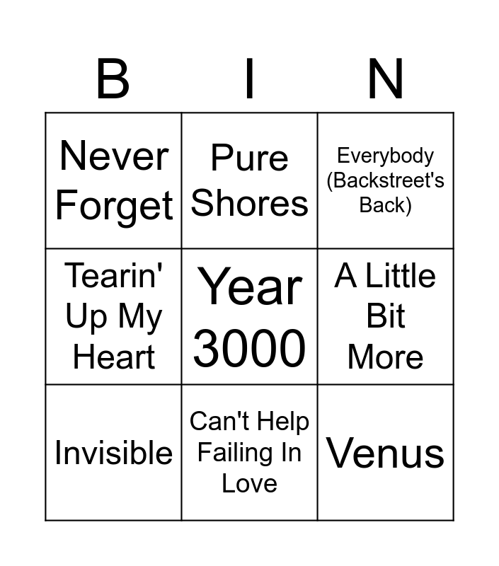 This bingo card has 45 words: Free!, Spice Up Your Life, If Ya Gettin' Down, C'est La Vie, Best Song Ever, Wings, Everybody (Backstreet's Back), Survivor, Year 3000, Scandalous, Tearin' Up My Heart, Sound Of The Underground, World Of Our Own, Push The Button, All Time Low, No Scrubs, One Love, Beep, Star Girl, Beat Again, Pure Shores, No Matter What, Whole Again, Never Forget, Crossroads, Black Heart, Freak Me, You Got It (The Right Stuff), Don't Let Go, If You Ever, Stay, Can We Dance, Cleopatra's Theme, Liquid Dreams, Finally Found, I Swear, Right Here, End Of The Road, Caught In The Middle, Can't Help Failing In Love, A Little Bit More, Venus, Hold On Me, Invisible and Can You Feel It?.