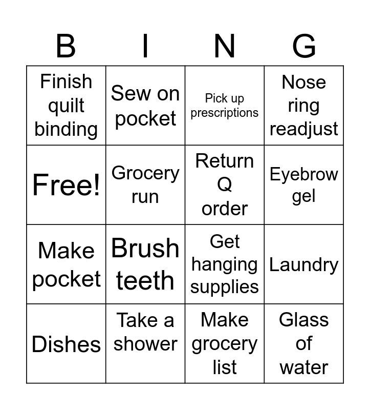 This bingo card has 16 words: Take a shower, Laundry, Pick up prescriptions, Finish quilt binding, Make pocket, Sew on pocket, Get hanging supplies, Make grocery list, Free!, Grocery run, Dishes, Nose ring readjust, Brush teeth, Eyebrow gel, Return Q order and Glass of water.