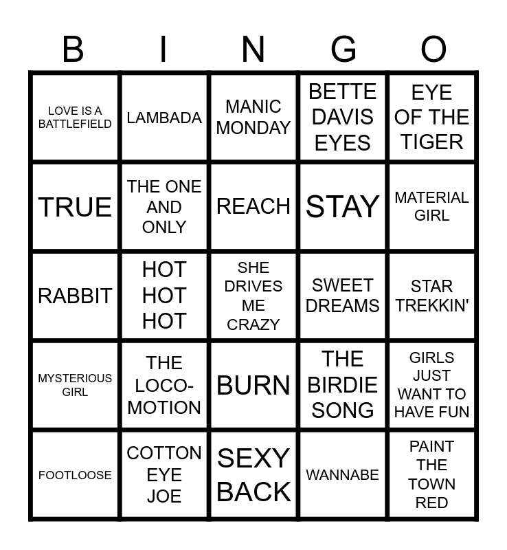 This bingo card has 60 words: LIVIN' ON A PRAYER, COTTON EYE JOE, ICE ICE BABY, MYSTERIOUS GIRL, WANNABE, DOWN UNDER, THE ONE AND ONLY, BARBIE GIRL, STAY, NO LIMIT, BETTE DAVIS EYES, WE BUILT THIS CITY, TRUE, IF I COULD TURN BACK TIME, WATERFALLS, LOVE IS A BATTLEFIELD, SHE DRIVES ME CRAZY, EYE OF THE TIGER, MAMBO NO. 5, REACH, SWEET DREAMS, MANIC MONDAY, FOOTLOOSE, GIRLS JUST WANT TO HAVE FUN, YOU CAN CALL ME AL, HUNGRY HEART, WALKING ON SUNSHINE, POUR SOME SUGAR ON ME, MATERIAL GIRL, JACK AND DIANE, MARGATE, PURPLE RAIN, D.I.S.C.O., HANDS UP, LAMBADA, HAPPY BIRTHDAY, TIME WARP, HOT HOT HOT, AINT NO PLEASING YOU, RABBIT, AGADOO, THE LOCO-MOTION, STAR TREKKIN', YMCA, THE BIRDIE SONG, UMBRELLA, HEY YA!, DROP IT LIKE ITS HOT, VIVA LA VIDA, BURN, SEXY BACK, GREEN GREEN GRASS, SINCE YOU'VE BEEN GONE, DILEMMA, FLOWERS, ANTI-HERO, IM GOOD (BLUE), SPRINTER, PAINT THE TOWN RED and BAD HABITS.