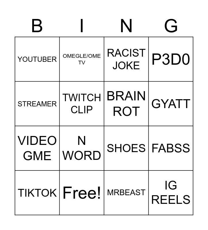 This bingo card has 25 words: OF girl, Prank, GYATT, AI CHAT, STREAMER, YOUTUBER, TWITCH CLIP, OMEGLE/OME TV, Free!, FORNITE, VIDEO GME, SHOES, RAPPER, ANDREW TATE, BRAIN ROT, FABSS, MRBEAST, RACIST JOKE, N WORD, FABSS, TIKTOK, KAI CENAT, IG REELS, P3D0 and EDGAR.
