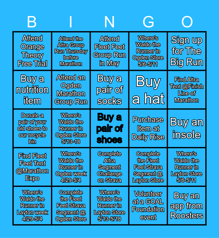 This bingo card has a free space and 24 words: Where's Waldo the Runner in Layton week 4/29-5/4, Where's Waldo the Runner in Ogden week 4/29-5/4, Buy a pair of socks, Volunteer at a GOAL Foundation event, Sign up for The Big Run, Attend Orange Theory Free Trial, Attend the Altra Group Run Thursday before Marathon, Attend Fleet Feet Group Run in May, Purchase Item at Daily Rise, Buy an insole, Donate a pair of your old shoes to our recycle bin, Attend an Ogden Marathon Group Run, Complete the Fleet Feet Strava Segment @ Layton Store, Where's Waldo the Runner in Layton Store 5/6-5/11, Buy a nutrition item, Complete the Fleet Feet Strava Segment @ Ogden Store, Where's Waldo the Runner in Layton Store 5/13-5/18, Where's Waldo the Runner in Ogden Store 5/6-5/11, Find Altra Tent @Finish Line of Marathon, Find Fleet Feet Tent @Marathon Expo, Where's Waldo the Runner in Ogden Store 5/13-18, Complete Altra Segment Challange on Strava, Buy a hat and Buy an app from Roosters.