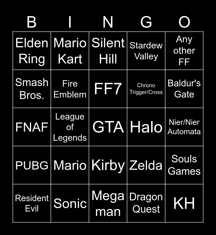 This bingo card has 25 words: Mario, Mega man, FF7, Resident Evil, Any other FF, Elden Ring, Smash Bros., Mario Kart, Halo, Kirby, Chrono Trigger/Cross, FNAF, Zelda, Souls Games, Fire Emblem, KH, Nier/Nier Automata, Silent Hill, Baldur's Gate, League of Legends, GTA, Sonic, PUBG, Stardew Valley and Dragon Quest.