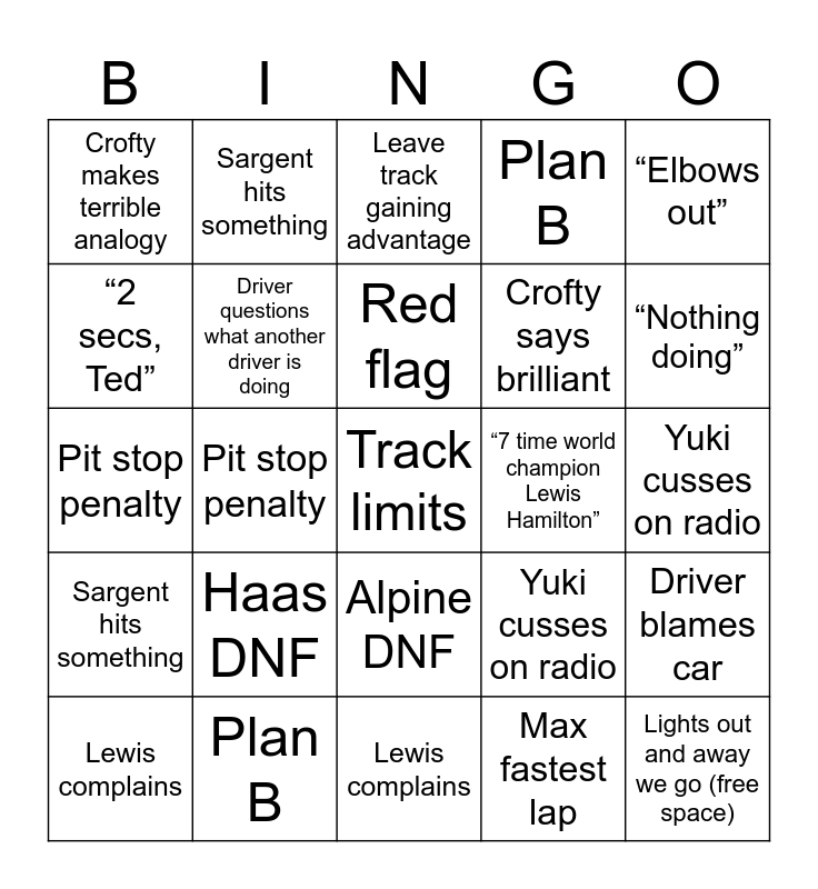 This bingo card has a free space and 48 words: Free!, Lights out and away we go (free space), “Nothing doing”, Lewis complains, Haas DNF, Alpine DNF, Sargent hits something, Safety car, “2 secs, Ted”, “Tyres are gone”/“no grip”, Driver questions what another driver is doing, Plan B, Driver blames car, Yuki cusses on radio, Max ignores team orders, Yellow flag, Red flag, “7 time world champion Lewis Hamilton”, Leave track gaining advantage, “Elbows out”, Pit stop penalty, Max fastest lap, Crofty makes terrible analogy, Crofty says brilliant, Alpine finishes last, “Nothing doing”, Lewis complains, Haas DNF, Alpine DNF, Sargent hits something, Safety car, “2 secs, Ted”, “Tyres are gone”/“no grip”, Driver questions what another driver is doing, Plan B, Track limits, Driver blames car, Yuki cusses on radio, Max ignores team orders, Yellow flag, Red flag, “7 time world champion Lewis Hamilton”, Leave track gaining advantage, “Elbows out”, Pit stop penalty, Max fastest lap, Crofty makes terrible analogyCrofty says brilliant and Alpine finishes last.