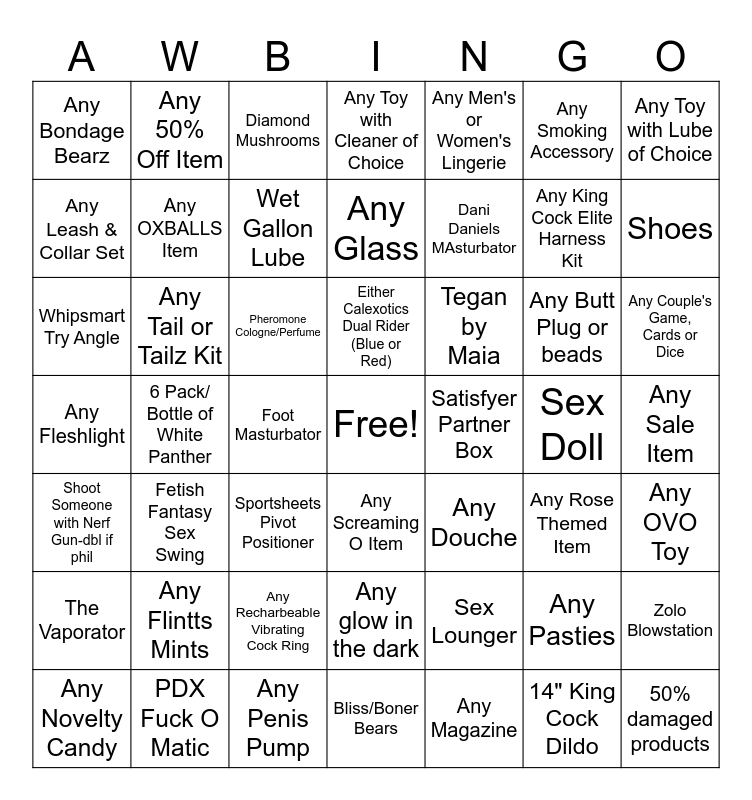 This bingo card has a free space and 48 words: Sex Lounger, Any King Cock Elite Harness Kit, Bliss/Boner Bears, 6 Pack/ Bottle of White Panther, Pheromone Cologne/Perfume, Any Sale Item, Any 50% Off Item, PDX Fuck O Matic, Any Smoking Accessory, Any Screaming O Item, Any Toy with Lube of Choice, Any Toy with Cleaner of Choice, Any Butt Plug or beads, Tegan by Maia, The Vaporator, Sex Doll, Any Leash & Collar Set, Shoes, Any Pasties, Any Men's or Women's Lingerie, Dani Daniels MAsturbator, Foot Masturbator, Any Bondage Bearz, Any OXBALLS Item, Zolo Blowstation, Wet Gallon Lube, Any Couple's Game, Cards or Dice, Any Novelty Candy, Either Calexotics Dual Rider (Blue or Red), Any Tail or Tailz Kit, 14" King Cock Dildo, Satisfyer Partner Box, Any OVO Toy, Any Flintts Mints, Any Fleshlight, Any Douche, Any Rose Themed Item, Whipsmart Try Angle, Sportsheets Pivot Positioner, Any Recharbeable Vibrating Cock Ring, Shoot Someone with Nerf Gun-dbl if phil, 50% damaged products, Diamond Mushrooms, Any Penis Pump, Any Glass, Any glow in the dark, Fetish Fantasy Sex Swing and Any Magazine.