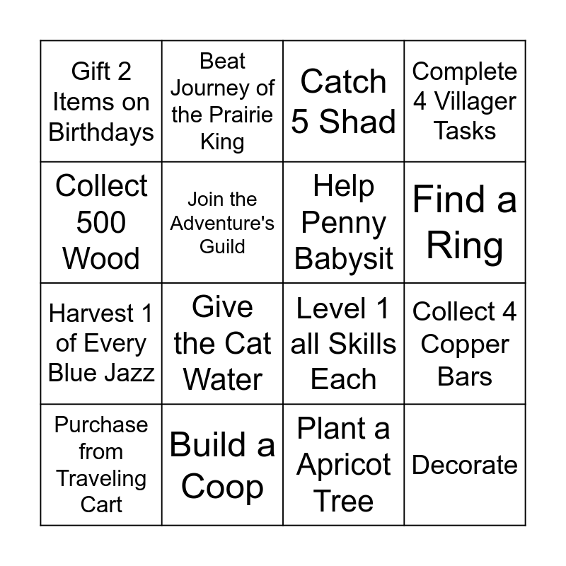 This bingo card has 16 words: Build a Coop, Collect 4 Copper Bars, Catch 5 Shad, Gift 2 Items on Birthdays, Harvest 1 of Every Blue Jazz, Beat Journey of the Prairie King, Level 1 all Skills Each, Plant a Apricot Tree, Collect 500 Wood, Join the Adventure's Guild, Purchase from Traveling Cart, Complete 4 Villager Tasks, Give the Cat Water, Find a Ring, Help Penny Babysit and Decorate.