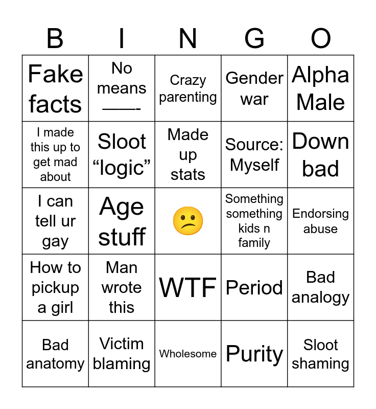 This bingo card has a free space and 24 words: Man wrote this, Victim blaming, Made up stats, Bad anatomy, Alpha Male, Fake facts, I made this up to get mad about, No means ——-, Something something kids n family, WTF, Source: Myself, I can tell ur gay, Period, Bad analogy, Sloot “logic”, Purity, Endorsing abuse, Crazy parenting, Down bad, Age stuff, Sloot shaming, How to pickup a girl, Gender war and Wholesome.