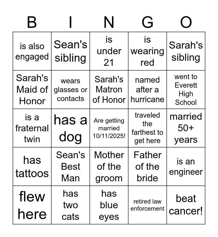 This bingo card has a free space and 24 words: Sean's Best Man, has two cats, Sarah's Matron of Honor, flew here, Sarah's sibling, is also engaged, Sarah's Maid of Honor, Sean's sibling, traveled the farthest to get here, Mother of the groom, named after a hurricane, is a fraternal twin, Father of the bride, is an engineer, wears glasses or contacts, retired law enforcement, married 50+ years, is under 21, went to Everett High School, has a dog, beat cancer!, has tattoos, is wearing red and has blue eyes.