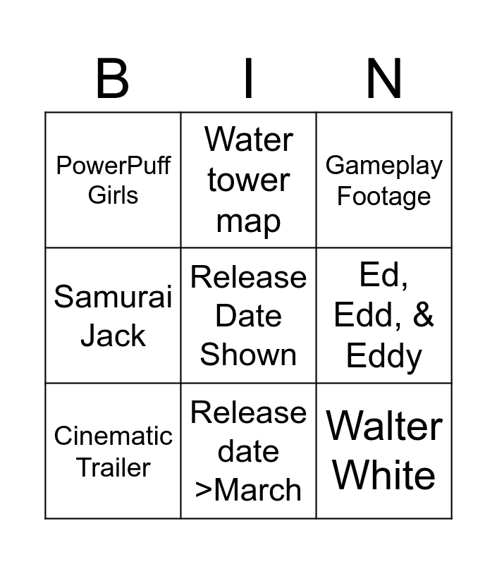 This bingo card has a free space and 9 words: Cinematic Trailer, Gameplay Footage, Water tower map, Samurai Jack, PowerPuff Girls, Ed, Edd, & Eddy, Walter White, Netcode fix and Release date >March.