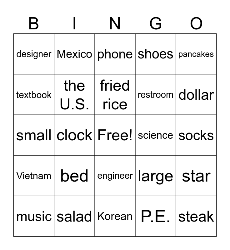 This bingo card has a free space and 38 words: doctor, airplane, noodles, the U.S., star, bed, fried rice, math, pancakes, restroom, clock, shoes, steak, socks, textbook, Vietnam, movie director, phone, heart, science, designer, salad, dollar, music, Australia, Korean, medium, writer, Canada, bedroom, pizza, engineer, P.E., Mexico, sofa, large, small and kitchen.