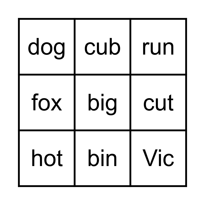 This bingo card has 9 words: hot, run, cub, fox, dog, cut, big, Vic and bin.
