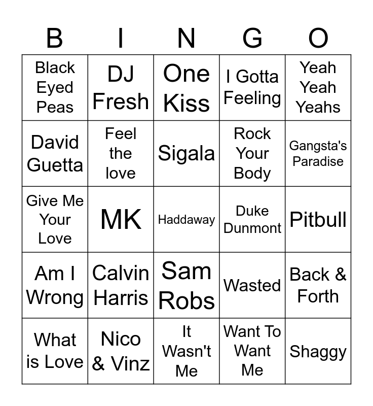 This bingo card has 80 words: One More Time, Daft Punk, One Kiss, Dua Lipa, Kickstarts, Flo Rider, Wild Ones, Sweet Female Attitude, Flowers, Example, This Is What You Came For, Rihanna, I Gotta Feeling, Black Eyed Peas, Time of Our Lives, David Guetta, Where Them Girls At, Calvin Harris, My Way, Pitbull, Heads Will Roll, Yeah Yeah Yeahs, Give Me Your Love, Sigala, Feel the love, Swedish House Mafia, Don't You Worry Child, Blonde, All Cried Out, Rudimental, Gangsta's Paradise, Coolio, It Wasn't Me, Shaggy, What is Love, Duke Dunmont, Real Life, Joel Corry, Sorry, Haddaway, First Time, M-22, Moving Too Fast, Artful Dodger, Dance Wit Me, DJ Fresh, Gold Dust, Ella Eyre, Gravity, Dizzee Rascal, Back & Forth, MK, Wasted, Tiësto, No Scrubs, Room 5, Make Luv, Outkast, Hey Ya!, Sam Robs, Rock Your Body, Justin Timberlake, Push The Feeling On, Nightcrawlers, The Real Slim Shady, Sigma, Nobody To Love, Wiley, Wearing My Rolex, Eminem, Am I Wrong, Nico & Vinz, My Love, Jess Glynne, Beautiful People, Jason Derulo, Want To Want Me, 99 Souls, This Girl is Mine and Chris Brown.