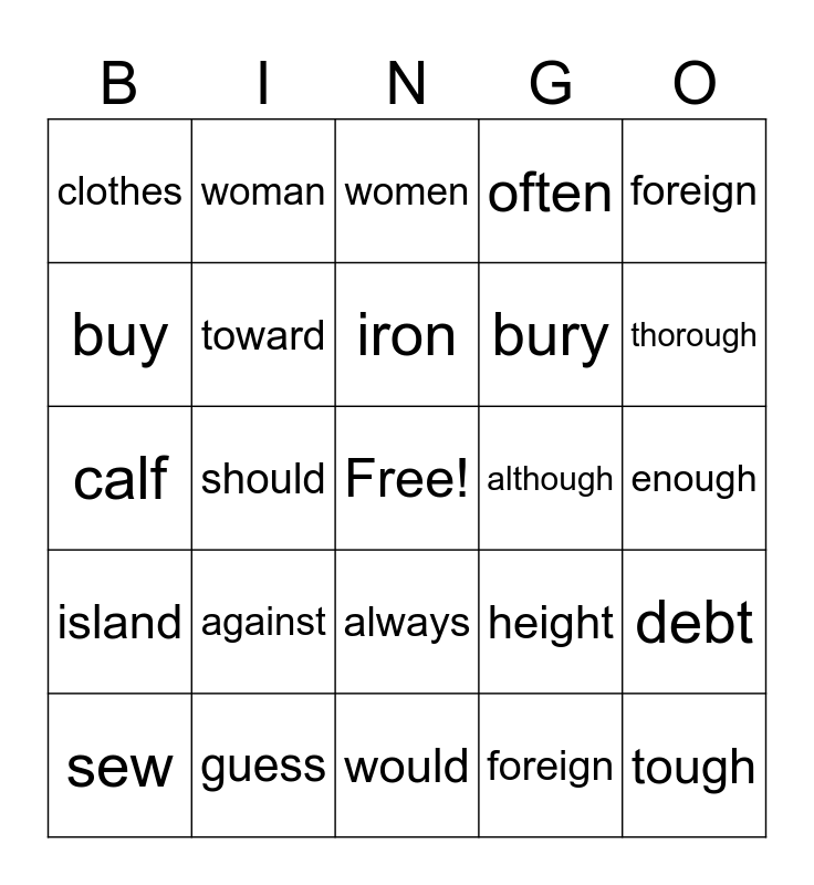 This bingo card has a free space and 31 words: would, could, should, where, clothes, women, toward, height, although, foreign, enough, tough, rough, cough, thorough, cough, debt, against, island, always, foreign, brought, sew, woman, bury, buy, often, calf, guess, iron and were.