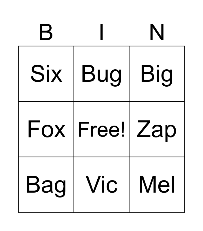This bingo card has a free space and 9 words: Bag, Big, Bug, Fox, Six, Zap, Mel, Kev and Vic.