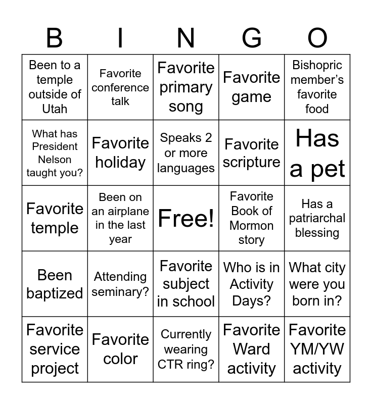 This bingo card has a free space and 25 words: Attending seminary?, Currently wearing CTR ring?, Speaks 2 or more languages, Favorite service project, Bishopric member’s favorite food, Been to a temple outside of Utah, What has President Nelson taught you?, Favorite conference talk, Favorite Book of Mormon story, Favorite subject in school, Favorite scripture, Favorite temple, Who is in Activity Days?, What city were you born in?, Favorite holiday, Favorite family tradition, Has a patriarchal blessing, Favorite primary song, Has a pet, Been on an airplane in the last year, Favorite YM/YW activity, Favorite color, Been baptized, Favorite game and Favorite Ward activity.
