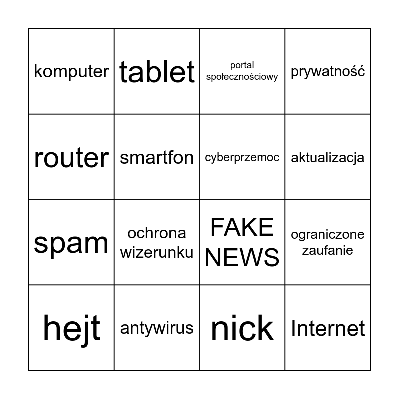 This bingo card has 23 words: Internet, linki, aktualizacja, programy, router, komputer, smartfon, tablet, hejt, ochrona danych, ochrona wizerunku, spam, bezpieczne hasło, facebook, antywirus, gry komputerowe, portal społecznościowy, FAKE NEWS, cyberprzemoc, ograniczone zaufanie, prywatność, nick and komunikator.