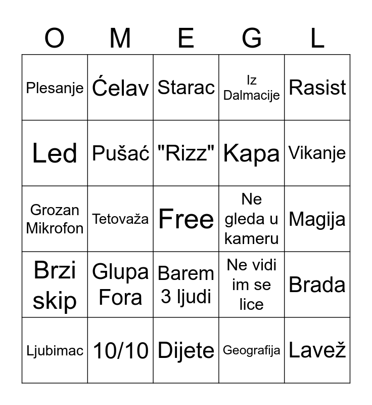 This bingo card has a free space and 24 words: Glupa Fora, 10/10, "Rizz", Ljubimac, Rasist, Plesanje, Led, Ćelav, Ne gleda u kameru, Barem 3 ljudi, Kapa, Grozan Mikrofon, Ne vidi im se lice, Brada, Pušać, Geografija, Magija, Starac, Vikanje, Tetovaža, Lavež, Brzi skip, Iz Dalmacije and Dijete.