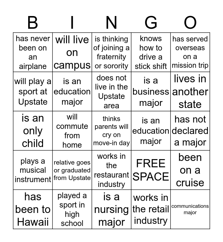 This bingo card has 25 words: relative goes or graduated from Upstate, is a nursing major, does not live in the Upstate area, has been to Hawaii, has served overseas on a mission trip, has never been on an airplane, will play a sport at Upstate, will live on campus, is an education major, works in the restaurant industry, is a business major, is an only child, FREE SPACE, been on a cruise, is an education major, communications major, has not declared a major, is thinking of joining a fraternity or sorority, lives in another state, will commute from home, thinks parents will cry on move-in day, played a sport in high school, plays a musical instrument, knows how to drive a stick shift and works in the retail industry.