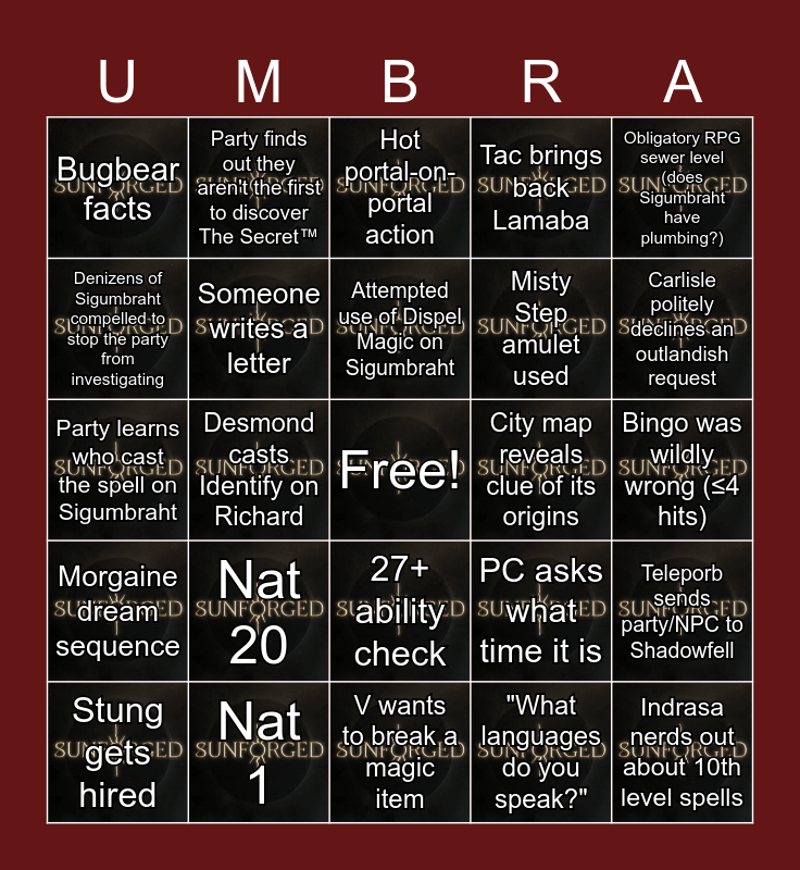 This bingo card has 24 images, a free space and 24 words: Nat 20, Nat 1, Attempted use of Dispel Magic on Sigumbraht, Stung gets hired, Obligatory RPG sewer level (does Sigumbraht have plumbing?), Bugbear facts, Denizens of Sigumbraht compelled to stop the party from investigating, Party finds out they aren't the first to discover The Secret™, City map reveals clue of its origins, 27+ ability check, Misty Step amulet used, Party learns who cast the spell on Sigumbraht, PC asks what time it is, Teleporb sends party/NPC to Shadowfell, Someone writes a letter, "What languages do you speak?", Bingo was wildly wrong (≤4 hits), Hot portal-on-portal action, Carlisle politely declines an outlandish request, Desmond casts Identify on Richard, Indrasa nerds out about 10th level spells, Morgaine dream sequence, Tac brings back Lamaba and V wants to break a magic item.