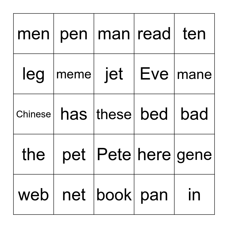 This bingo card has a free space and 24 words: pet, net, jet, web, ten, men, leg, pen, bed, Pete, Eve, Chinese, here, gene, meme, pan, bad, man, mane, has, in, the, read and book.