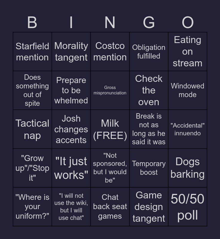 This bingo card has a free space and 37 words: Visa abuse, Chat gets stressed about level ups, Matt Berry voice, Prepare to be whelmed, Dogs barking, "It just works", Gross mispronunciation, "Got any games on your phone?", Eating on stream, Josh misses something obvious, Josh changes accents, Obligation fulfilled, 50/50 poll, "Accidental" innuendo, Does something out of spite, "Grow up"/"Stop it", Josh discovers a cheese strat, Costco mention, "Not sponsored, but I would be", Break is not as long as he said it was, Starfield mention, Windowed mode, "Where is your uniform?", Chat back seat games, "Nice" 69, Game design tangent, Morality tangent, Real life advice, Henry Cavill, "Don't clip this", Stolen joke from chat, "I will not use the wiki, but I will use chat", Tactical nap, "Obsidian, not Bethesda", Temporary boost, Check the oven and My safeword is "Apples".