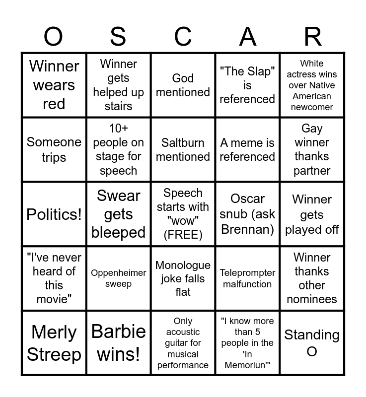This bingo card has a free space and 24 words: Oppenheimer sweep, Barbie wins!, Saltburn mentioned, Merly Streep, White actress wins over Native American newcomer, Winner wears red, Someone trips, Winner gets helped up stairs, Oscar snub (ask Brennan), Monologue joke falls flat, A meme is referenced, Politics!, Teleprompter malfunction, Winner thanks other nominees, 10+ people on stage for speech, "I know more than 5 people in the 'In Memoriun'", Winner gets played off, God mentioned, Gay winner thanks partner, Swear gets bleeped, Standing O, "I've never heard of this movie", "The Slap" is referenced and Only acoustic guitar for musical performance.
