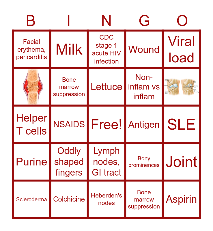 This bingo card has 2 images, a free space and 27 words: Scleroderma, Methotrexate, NSAIDS, Effector T cell, Facial erythema, pericarditis, CDC stage 1 acute HIV infection, Bone marrow suppression, Oddly shaped fingers, Antigen, Colchicine, SLE, Aspirin, Heberden's nodes, Bone marrow suppression, Ankylosis, Lymph nodes, GI tract, Purine, Viral load, Helper T cells, Bony prominences, Asthma, Non-inflam vs inflam, Wound, Milk, Joint, Lettuce and SQ.